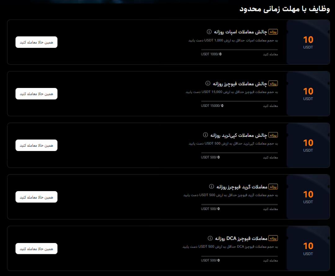 در بخش Reward Center، وظایف هفتگی وجود دارد که کاربران با انجام آنها میتوانند بونوسهای متنوعی دریافت کنند. این وظایف شامل فعالیتهایی مانند انجام حجم مشخصی از معاملات است.