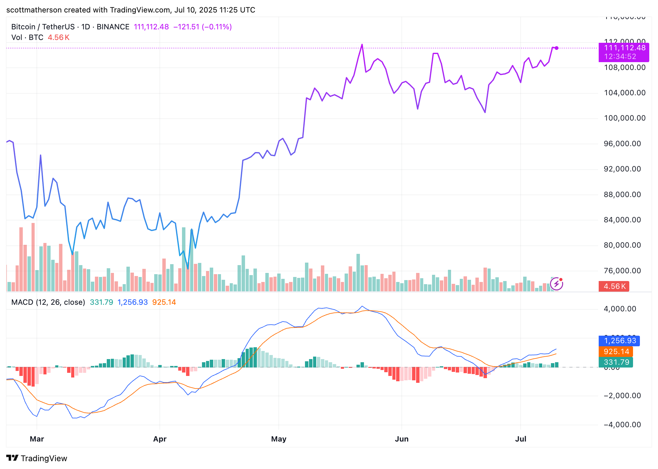 هم اکنون بیت کوین با قیمت ۱۱۱,۲۷۰ دلار معامله میشود. با وجود نزولی کمی که دیده میشود، بهتر است تمرکز خود را بر روی شناسایی فرصتهای طولانی مدت بگذارید تا از احتمال وقوع گردش قوی شکل گیرد، به جای تلاش برای کوتاه کردن سریع معاملات.