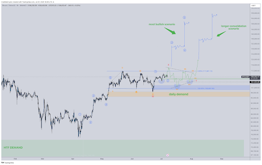 Credibull Crypto اخیراً یک تجزیه و تحلیل فنی دقیق را در مورد بیت کوین منتشر کرده است و توضیح داده که چرا اعتقاد دارد که کوتاه کردن بیت کوین در حال حاضر یک استراتژی پرخطر است. تحلیل وی بر اساس شمارش موج الیوت در نمودار 8 ساعته شمعدان شده است. او به دو سناریوی ممکن اشاره کرده است. در اولین سناریو، او میگوید که قیمت ممکن است به بالای 110،000 دلار صعود کند و سپس یک بازگشت اصلاحی به سمت منطقه 102،000 دلاری رخ دهد که او آن را به عنوان یک سطح کلیدی تقاضای روزانه توصیه کرده است. نتیجه ممکن است یک تثبیت جانبی قبل از حرکت اصلی بعدی به سمت بالا باشد.