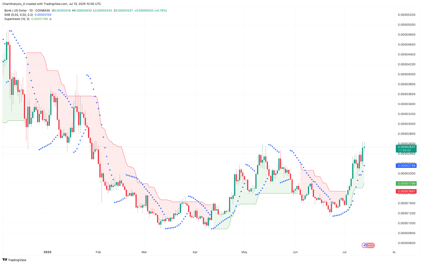 قیمت Bonk در طی روزهای گذشته تقریباً 40٪ از ایستگاه اول ژوئیه خود کاسته و در حال حاضر در بازه قیمتی بین 0.00002580 دلار و 0.00002630 دلار قرار دارد. این بازه قیمتی با پاسخگویی به پسوند 1.0 فیبوناچی از ساختار قبلی تغییرات سازگار است. شاخص های گوناگون ادامه حرکت صعودی را نشان میدهند، با Supertrend Fliped Green و Parabolic SAR که نشانههایی از ادامه روند صعودی دارند و در مواجهه با قیمت بسیاری پایین تر هستند.