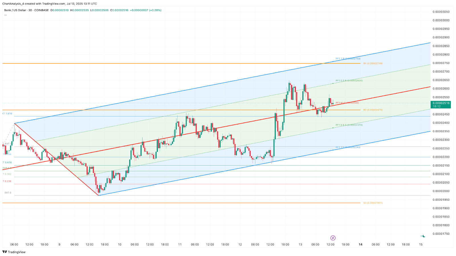 بنک، با احترام، به خط میانی کانال Pitchfork از تاریخ 8 ژوئیه تعلق دارد. فعلاً، قیمت دقیقاً بالاتر از حمایت خط میانی حدود 0.00002500 دلار قرار دارد و مقاومت خط اوجی نزدیک به 0.00002750 دلار مشاهده میشود. شکست این سطح ممکن است به سرعت فشاری برای رسیدن به سطح 0.00003000 دلار ایجاد کند.